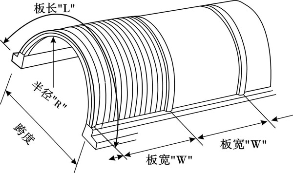 安装拱形时,阳光板的弯曲方向必须与骨架方向平行,即顺着肋的方向弯曲,若弯曲方向错误,板材容易被破坏。如图可知,依不同的曲率半径R(mm),来决定阳光板跨度W(IIun),其中板材长度“L”则需大于或等于板材宽度“W”。