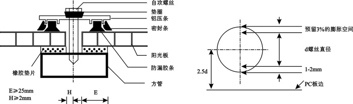 ● 钻孔与板材边缘的距离不应小于40毫米,孔径必须大于螺栓,螺 钉或其它紧固用零件直径的50%,以便为热膨胀留出余地。