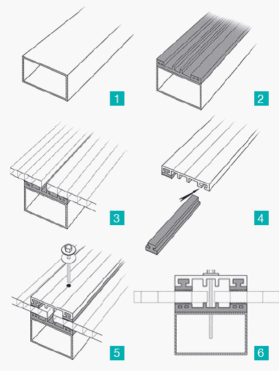 6. 用一种由铝合金连接型材和密封垫(弹性体)组成的装配系统将板材固定。